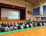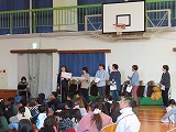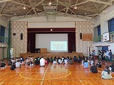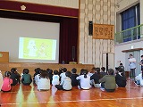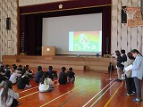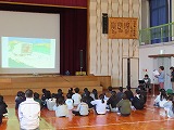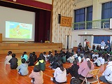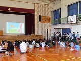 今日は、プロジェクターで紙芝居を大きく映して全校で読み聞かせを聞きました。