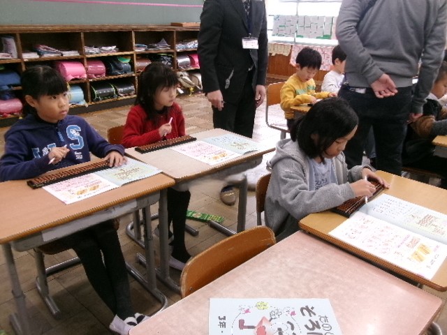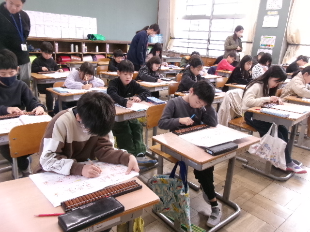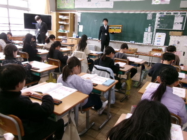 京都珠算振興会より講師の先生に来ていただき、3年生はそろばんを学習しました。