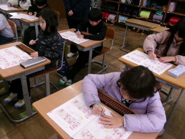 そろばん自体に初めて触れる児童も多く、興味津々で先生のお話を聞き、そろばんを使って一生懸命計算していました。