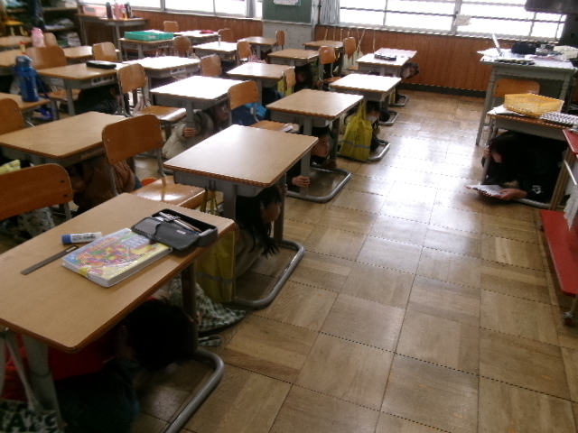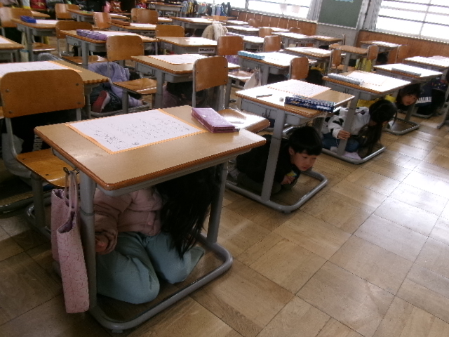 地震が起きたら、すぐに身を守るために机の下に避難します。