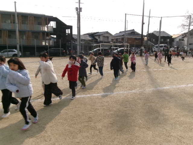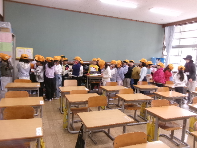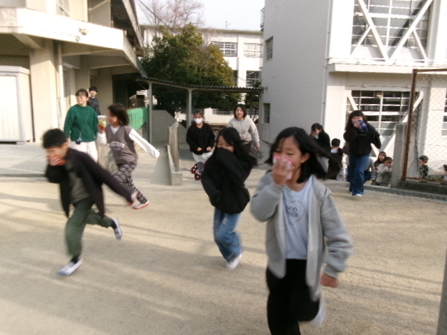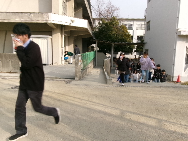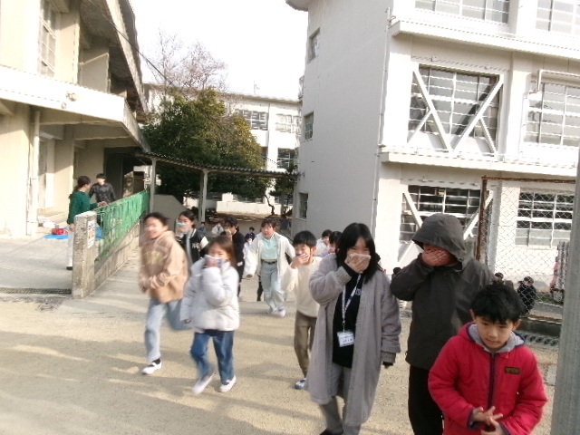 その放送を聞いたら、教室で列に並び、口をおさえ、すばやく運動場に避難します。