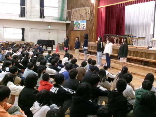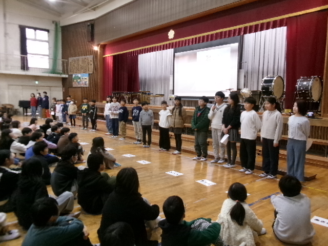 全校集会では、児童会の取組のまとめの発表と後期児童会本部役員のあいさつがありました。