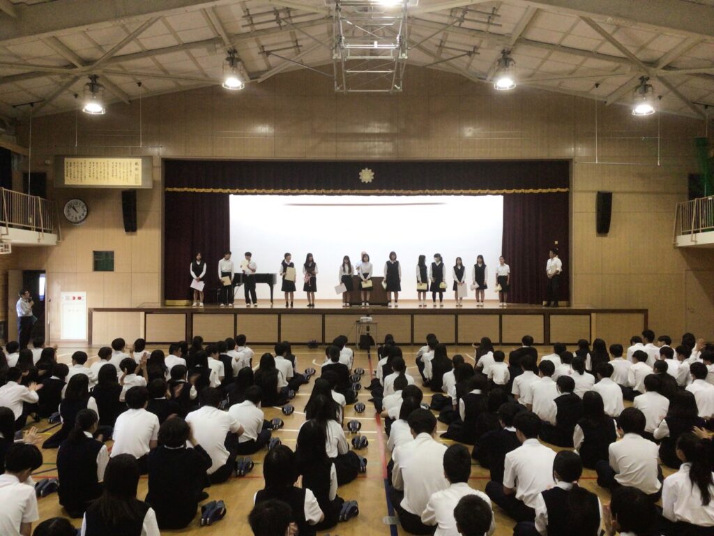 中間テスト後、体育館に全校生徒が集まり伝達表彰式を行いました。綴喜地方中学校新人体育大会やポスターコンクールなど、生徒たちの日々の努力と成果が讃えられました。