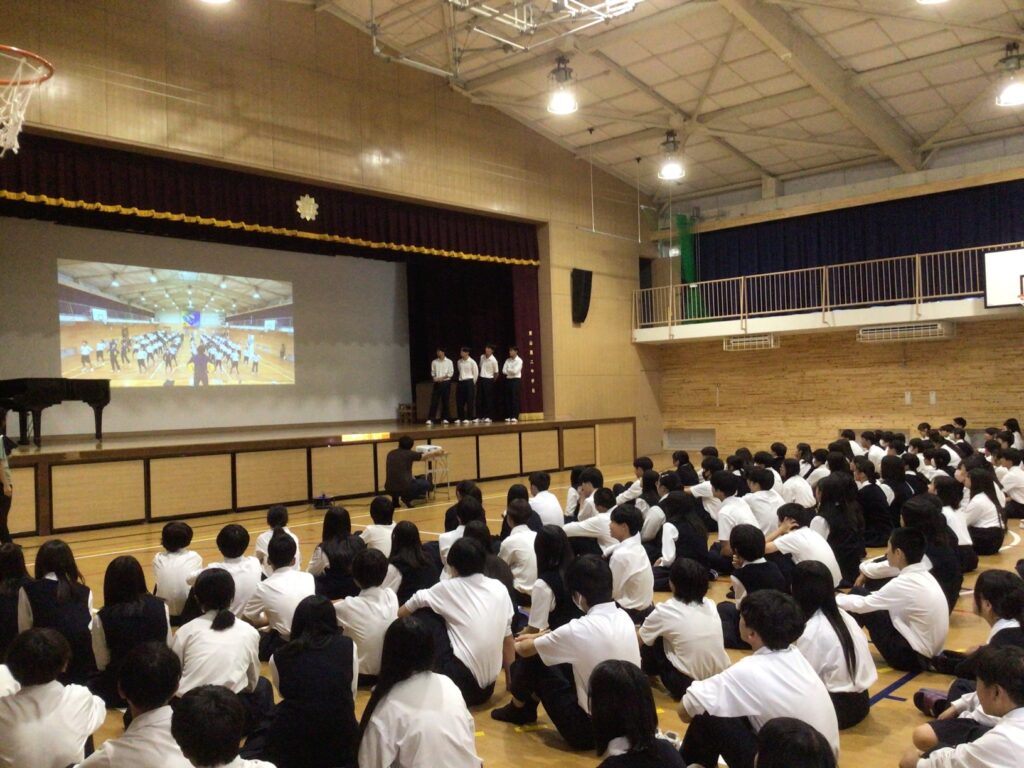 その後、体育大会に向けて各ブロック長が「あいさつやラジオ体操で心を一つにし、最高の大会にしたい」と熱い想いを語りました。さらに、今年の体育大会スローガン『超越団結〜思いをカタチに友と創る 明日へ育つ体育大会〜』が発表され、スローガンに込められた思いが全校に共有されました。