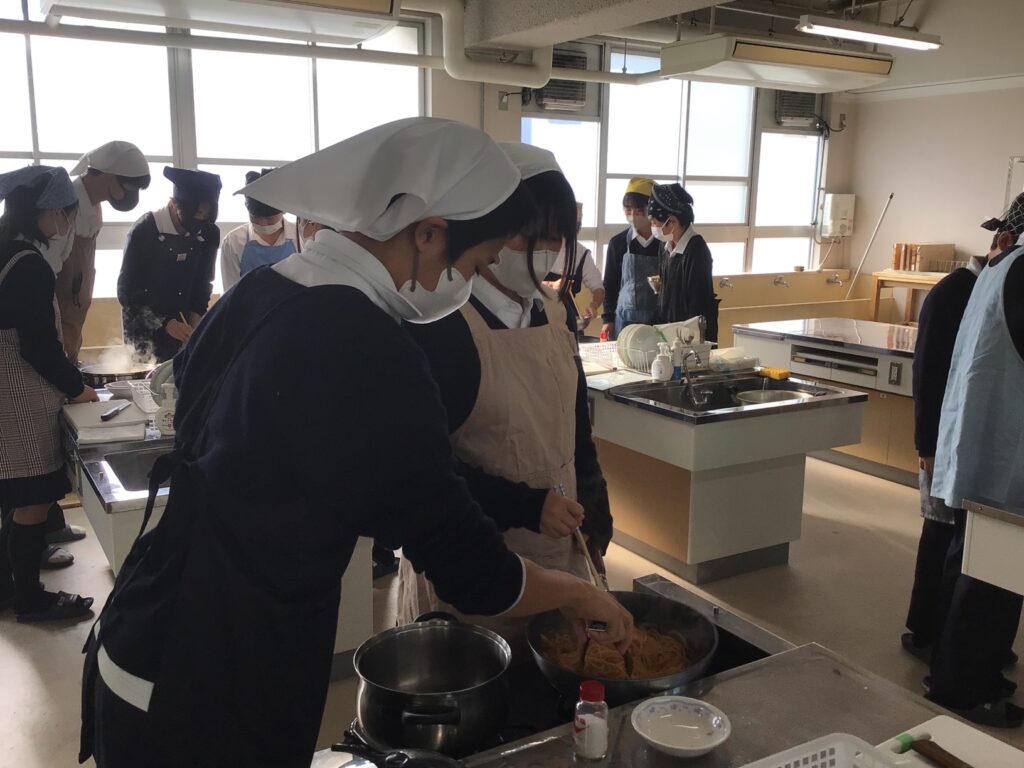 2年生が家庭科の授業で調理実習を行い、ナポリタンづくりに挑戦しました。