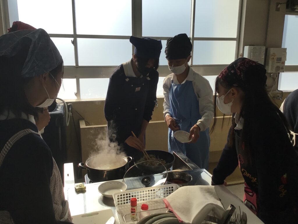 各班で、材料を切る人、炒める人、盛り付ける人など役割を分担し、声をかけ合いながら協力して調理を進めました。麺のゆで加減や味付けを相談する姿からは、主体的に学ぶ姿勢や仲間を大切にする気持ちが感じられ、どの班も楽しそうに取り組んでいました。仕上がったナポリタンはどれもおいしく、達成感に笑顔が広がる時間となりました。