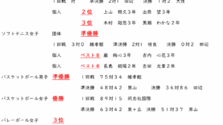 4月18日(土)19日(日)綴喜中学校春季体育大会が綴喜の各会場で開催されました。剣道部・女子バスケットボール部が見事優勝、男子ソフトテニス部、女子ソフトテニス部、男子バスケットボール部が準優勝に輝き健闘しました。全ての部活動で、秋の新人...