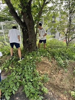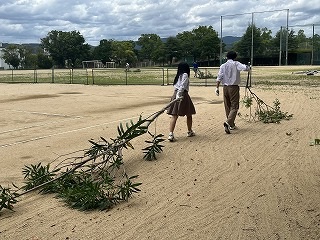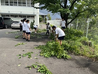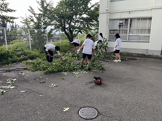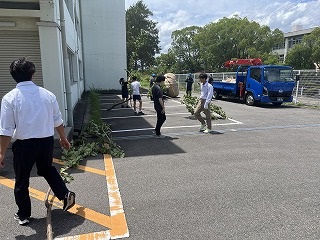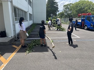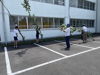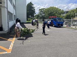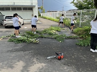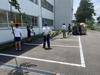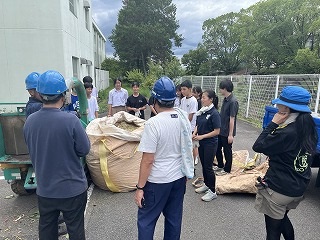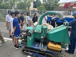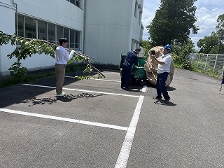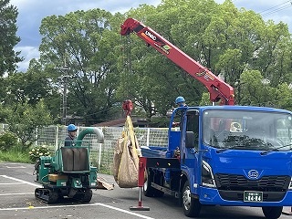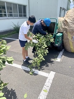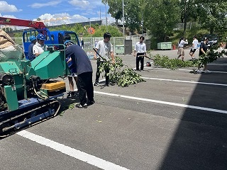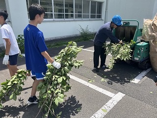 7月18日(金)放課後に三中SDGsプロジェクトを開催しました。終業式に生徒会が今回協力していただくエースジャパン株式会社の紹介とチップ作り体験の説明をしました。放課後、先日と本日に校内の伐採した枝を生徒会と有志で運び、エースジャパン株式会社の方と機械にいれチップを作成しました。