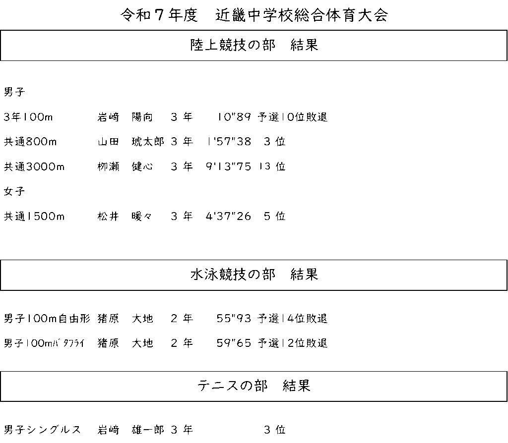 8月5日(火)~ 近畿中学校総合体育大会が滋賀県の各会場で開催されました。5日(火)テニス:大石緑地スポーツ村テニスコート・6日(水)7日(木)陸上競技:平和堂HATOスタジアム・7日(木)8日(金)水泳競技:インフロニア草津アクアティクセンターに出場しました。テニス男子個人シングルス3位、陸上競技男子800m3位、女子1500m5位に入賞しました。また、陸上競技の4名は全国大会に出場することが決まっています。結果は以下の通りです。