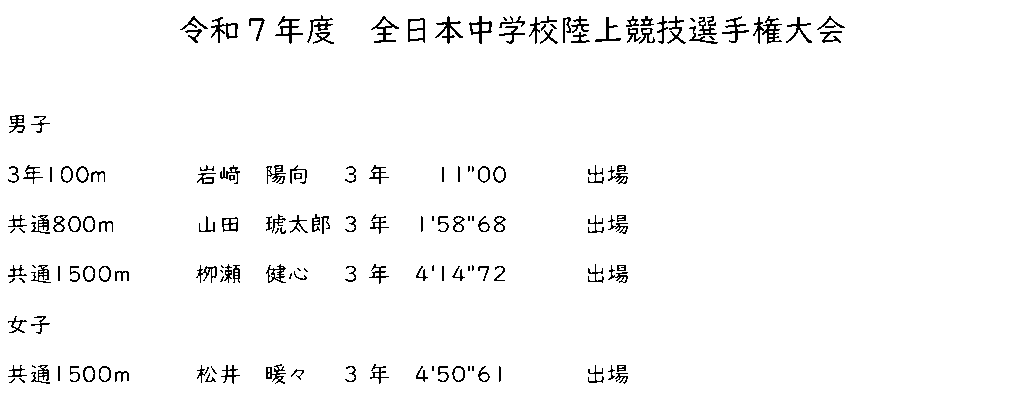 8月17日(日)~20日(水) 全日本中学校陸上競技選手権大会が沖縄県沖縄市の沖縄県総合運動公園陸上競技場で開催されました。本校から男子100m、800m、1500m、女子1500mに4名が出場しました。途中、台風接近により日程が変更されタイムテーブルも大幅に変更されるなど普段の大会とは異なり順応性を必要とされる大会となりました。その中で、4名全員とも思い出の残る競技をすることができました。たいへん良い経験になりました。結果は以下の通りです。