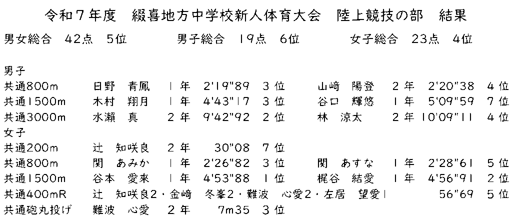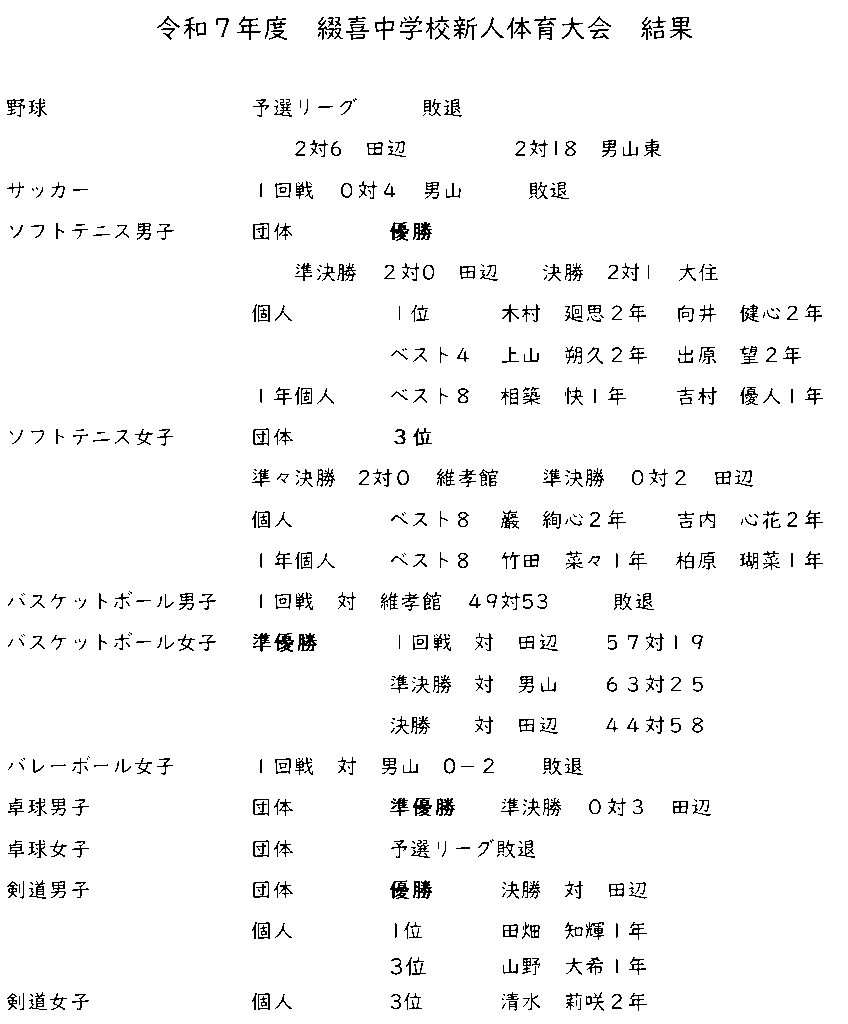 R7 綴喜中学校新人大会 03.学校行事 Twitter Facebook はてブ Pocket LINE コピー 2025.10.20 9月21日(日)綴喜中学校新人陸上大会が太陽が丘陸上競技場で、27日(土)28日(日)には各種目を綴喜の各会場で開催されました。1・2年生だけの初めての公式大会になり、来年に向けてのスタートになりました。各種目一生懸命がんばり健闘しました。ソフトテニス男子、剣道男子が見事優勝し、個人においても、多数優勝をしてくれました。結果は以下の通りです。 目次 陸上競技剣道卓球バレーボールソフトテニスサッカーバスケットボール野球 陸上競技 剣道 卓球 バレーボール ソフトテニス サッカー バスケットボール 野球 Post Views: 23
