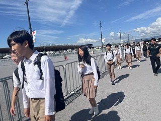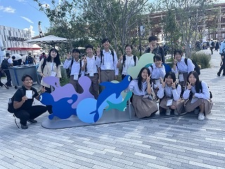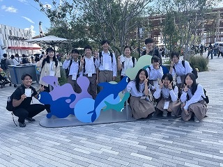 9月30日(火)「大阪・関西万博」において、本校の生徒会が取り組んでいる「SDGsプロジェクト」として企業と連携して作成されたベンチが会場内に設置されました。そこで、木津川市と精華町にまたがる関西文化学術研究都市企業がベンチや環境などについてイベントを開催されました。参加型イベントの協力依頼をうけ、未来社会の姿に触れ、世界とつながる体験をすることを目的に、本校「SDGsプロジェクト」のプレゼンテーションをヘルスケア館前で行いました。多くの観客の前で生徒会8名が堂々と発表をしました。
