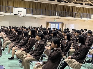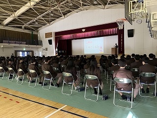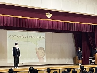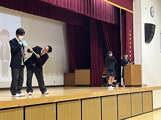 03.学校行事10月29日(水)5校時に体育館で2年生が、木津高校ビジネスマナー講座を受講しました。木津高校生が、社会に出たときの礼儀やマナーについてわかりやすく教えてくれました。また、来月の職場体験学習に向けて体験時のマナー等を学ぶことができました。