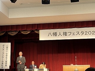 03.学校行事12月6日(土)第29回八幡市小・中学生人権啓発ポスターコンクール表彰式が、13時30分から八幡市人権・交流センターで開催されました。本校からは、1年生の吉村春馬さんが「個性があるってすてきだね」というタイトルで優秀賞を受賞しました。佳作には、1年生の奥村紋生さん「その優しさ 風に乗せて」、1年生の左居望愛さん「その一言で 心が傷つく」、1年生の雑賀柚穂さん「世界に個性あふれる笑顔の花を」、1年生の小池楓彩さん「奏でよう 個性のハーモニー」が選ばれました。