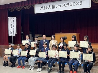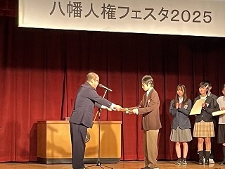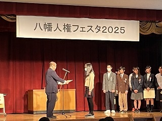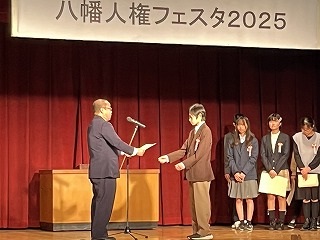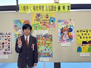 12月6日(土)第29回八幡市小・中学生人権啓発ポスターコンクール表彰式が、13時30分から八幡市人権・交流センターで開催されました。本校からは、1年生の吉村春馬さんが「個性があるってすてきだね」というタイトルで優秀賞を受賞しました。佳作には、1年生の奥村紋生さん「その優しさ 風に乗せて」、1年生の左居望愛さん「その一言で 心が傷つく」、1年生の雑賀柚穂さん「世界に個性あふれる笑顔の花を」、1年生の小池楓彩さん「奏でよう 個性のハーモニー」が選ばれました。