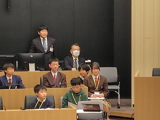 03.学校行事1月17日(土)13時から第8回八幡市子ども会議~市への提言~が市役所の議場で開催されました。市内小中高生が、特産品や環境問題、防災等について市へ提言しました。本校からは、2年生の武一陽さんと長村茉衣さんが参加し中学生班は、放置竹林と防災、避難所問題という多岐にわたる課題に対し、八幡の竹を使って「ゲル」と呼ばれるモンゴルの伝統的な住居をベースとしたテントを作ることを提言しました。