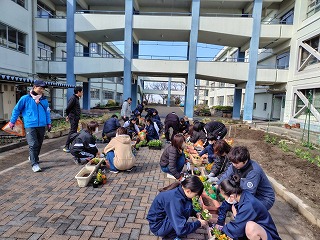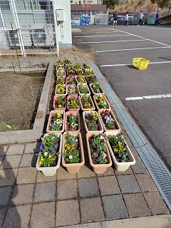 3月7日(土)PTA主催で、卒業式で飾られるプランターの花植会を実施しました。ボランティアと、吹奏楽部の参加で総勢約30名集まり、色とりどりの花の苗を土と一緒にプランターへ植えました。また、正門の花壇にも花を植えました。卒業式が華やかになり卒業生も喜ぶと思います。
