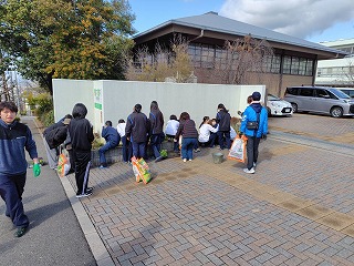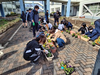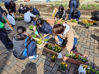 03.学校行事3月7日(土)PTA主催で、卒業式で飾られるプランターの花植会を実施しました。ボランティアと、吹奏楽部の参加で総勢約30名集まり、色とりどりの花の苗を土と一緒にプランターへ植えました。また、正門の花壇にも花を植えました。卒業式が華やかになり卒業生も喜ぶと思います。
