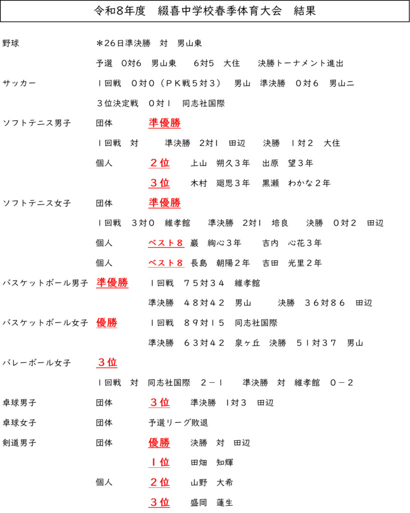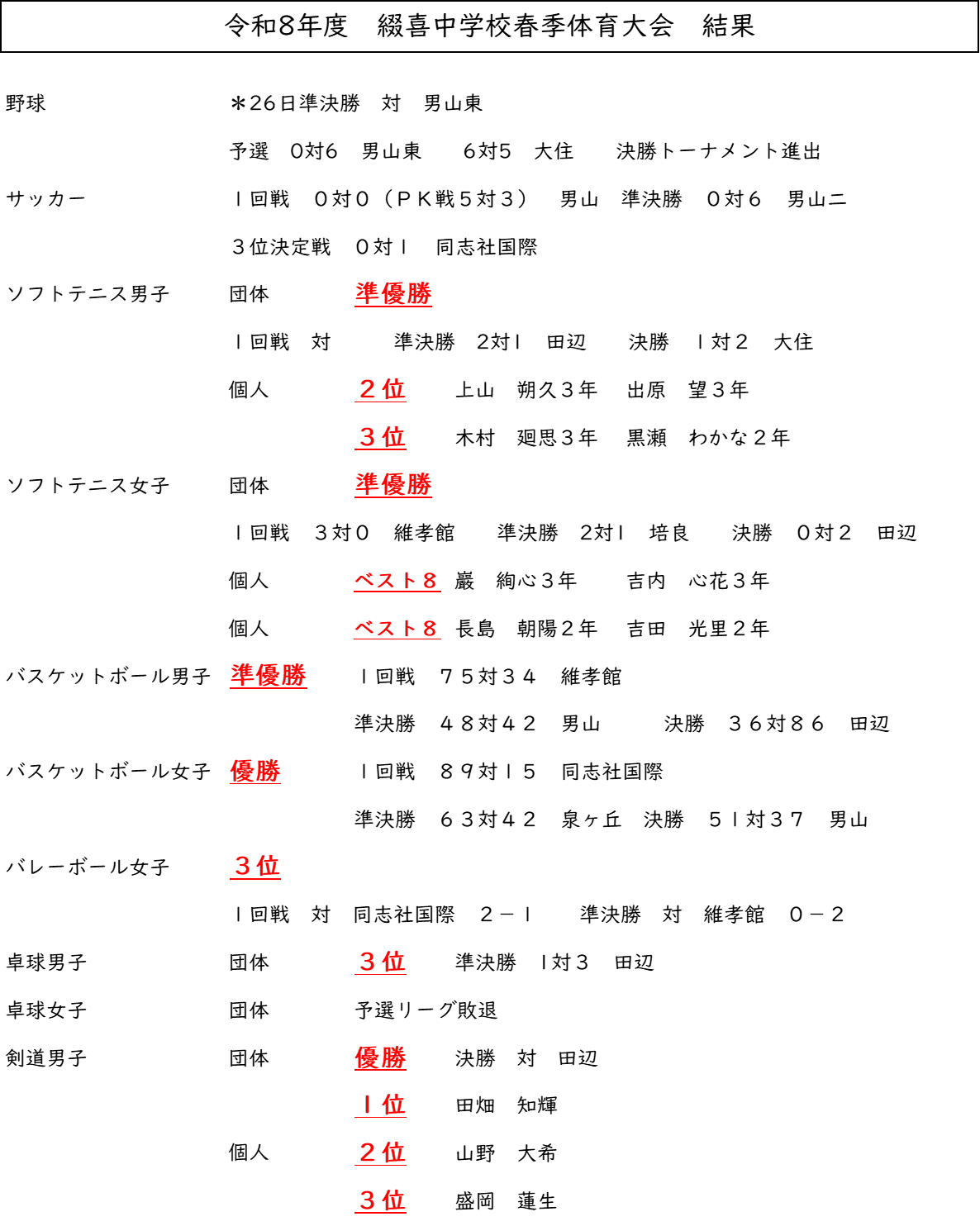 03.学校行事4月18日(土)19日(日)綴喜中学校春季体育大会が綴喜の各会場で開催されました。剣道部・女子バスケットボール部が見事優勝、男子ソフトテニス部、女子ソフトテニス部、男子バスケットボール部が準優勝に輝き健闘しました。全ての部活動で、秋の新人戦に比べ、冬場の練習が成果を現した結果となりました。勝敗以上に全力で競技に取り組む姿は素晴らしかったです。結果は以下の通りです。