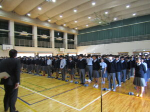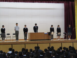11月14日(金)に安全教育の一環として、不審者侵入に備えた避難の仕方を身に着けるための訓練を行いました。引き続き、生徒会引継式を行い、令和6年11月から生徒会本部役員として活動していた2・3年生が任期を終えました。今後は委員会活動をはじめ、様々な活動の中心を1・2年生が担います。3年から受け継いだ本校の良き伝統を受け継ぎ更に発展させてくれることを期待しています。
