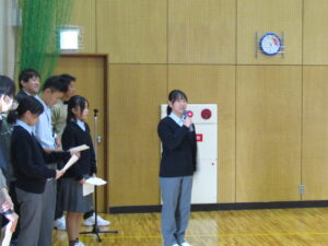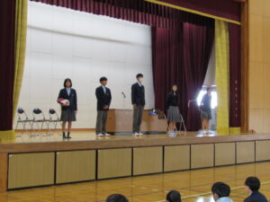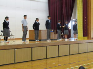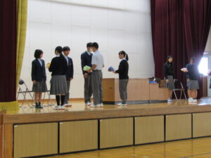 03.学校行事11月14日(金)に安全教育の一環として、不審者侵入に備えた避難の仕方を身に着けるための訓練を行いました。引き続き、生徒会引継式を行い、令和6年11月から生徒会本部役員として活動していた2・3年生が任期を終えました。今後は委員会活動をはじめ、様々な活動の中心を1・2年生が担います。3年から受け継いだ本校の良き伝統を受け継ぎ更に発展させてくれることを期待しています。