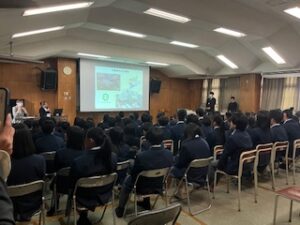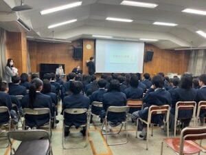 1月22 日(木)に健康的な生活習慣を習得し、命の大切さや生きることの素晴らしさ、周りの人たちの命を大切にする心の育成を目指し、「生命のがん教育授業」を1年生が実施しました。岡本記念病院 がん性疼痛看護・緩和ケア認定看護師 北村 和美様より、「がんに罹患すると身体はどんな状態になっているのか」や「健康的な生活習慣や健康診断の大切さ」などについて講義いただいた後、がん経験者として 京都府がん教育推進メッセンジャー 今井 美鈴様よりご自身の体験についてお話しいただきました。生徒たちは、健康診断の大切さや病気に向き合う姿勢や人とのつながりについて考えを深めていました。