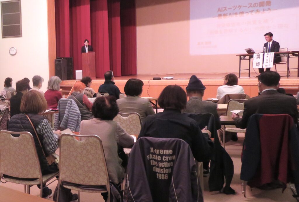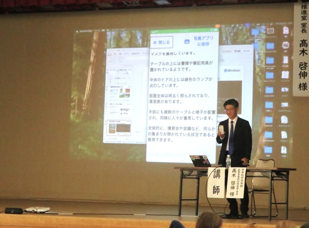研修会の講演・体験研修では、「AIスーツケースの開発-最新AIを使ってみよう-」と題し、日本科学未来館 副館長兼研究推進室室長 髙木 啓伸 様から大阪・関西万博で実装実験が行われたAIスーツケースのお話や視覚障害者のニーズがAIの進歩を支えてきた歴史について学びました。