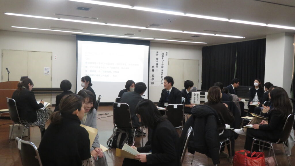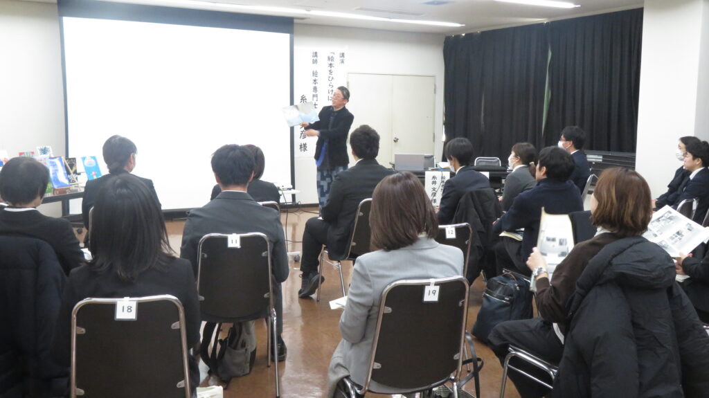 前半は「絵本をひらけば 世界がひろがる」と題し、絵本専門士の糸井 文彦 様に講演をしていただきました。糸井先生は現役の小学校教諭でもあり、絵本専門士・絵本作家としても活躍されているので、絵本の選び方や子どもたちと一緒に声を出しながら楽しむ読み聞かせの工夫、学級通信を通した読書啓発等、さまざまな視点から、絵本の楽しさや可能性を教えていただきました。