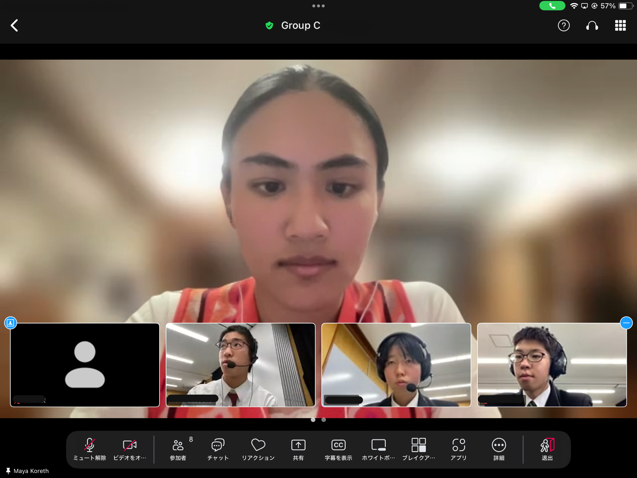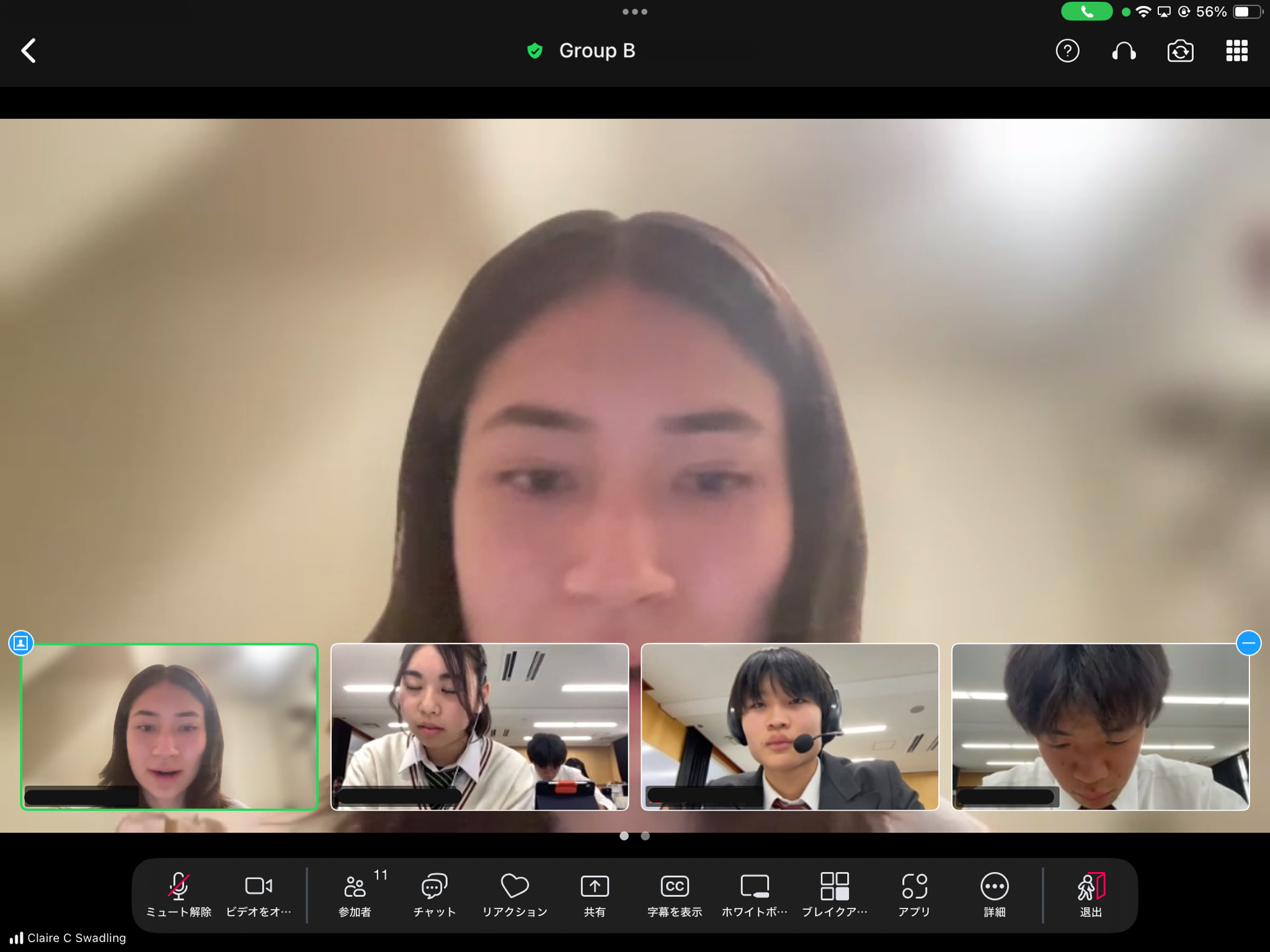 スピーチ後は、リーダーシップに関するケーススタディを題材に、英語によるディスカッションを行いました。初めは緊張した様子の生徒たちでしたが、大学生のリードにも助けられながら、自ら積極的に意見を述べたり、互いの考えを尊重しながら話し合いを深めたりする姿が印象的でした。英語で対話することへの楽しさも徐々に感じられるようになり、研修が進むにつれて表情が明るくなっていく様子がうかがえました。