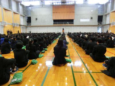 令和8年3月19日(木)、年度末の大掃除を終えた後、本校体育館にて修了式を行いました。はじめに校歌斉唱を行い、校長式辞では校歌3番の「うつくしき世のために まことある世のために」「命めでつつ」の歌詞に触れ、自他を大切にしながら未来へ力強く歩んでほしいという言葉がありました。