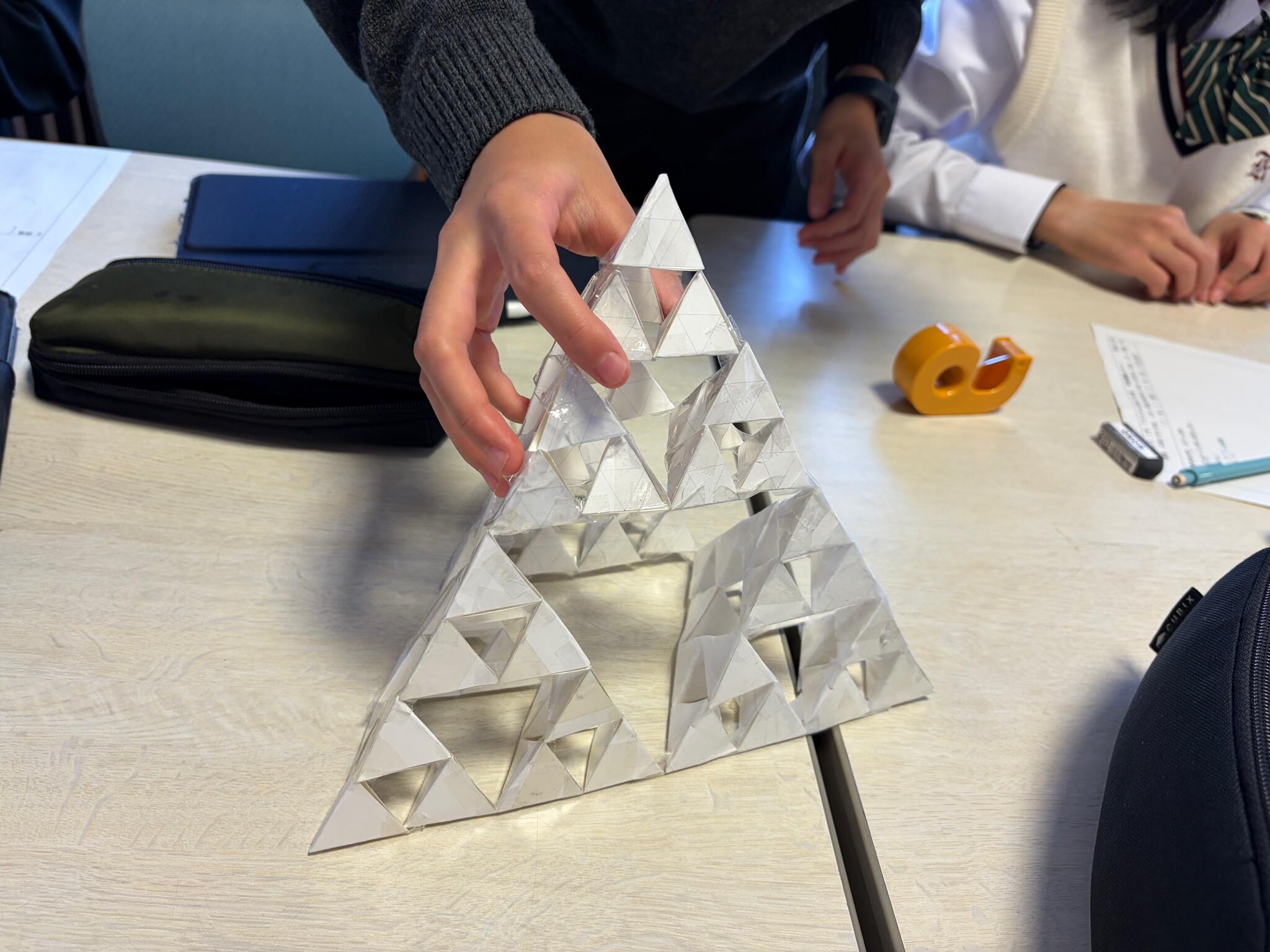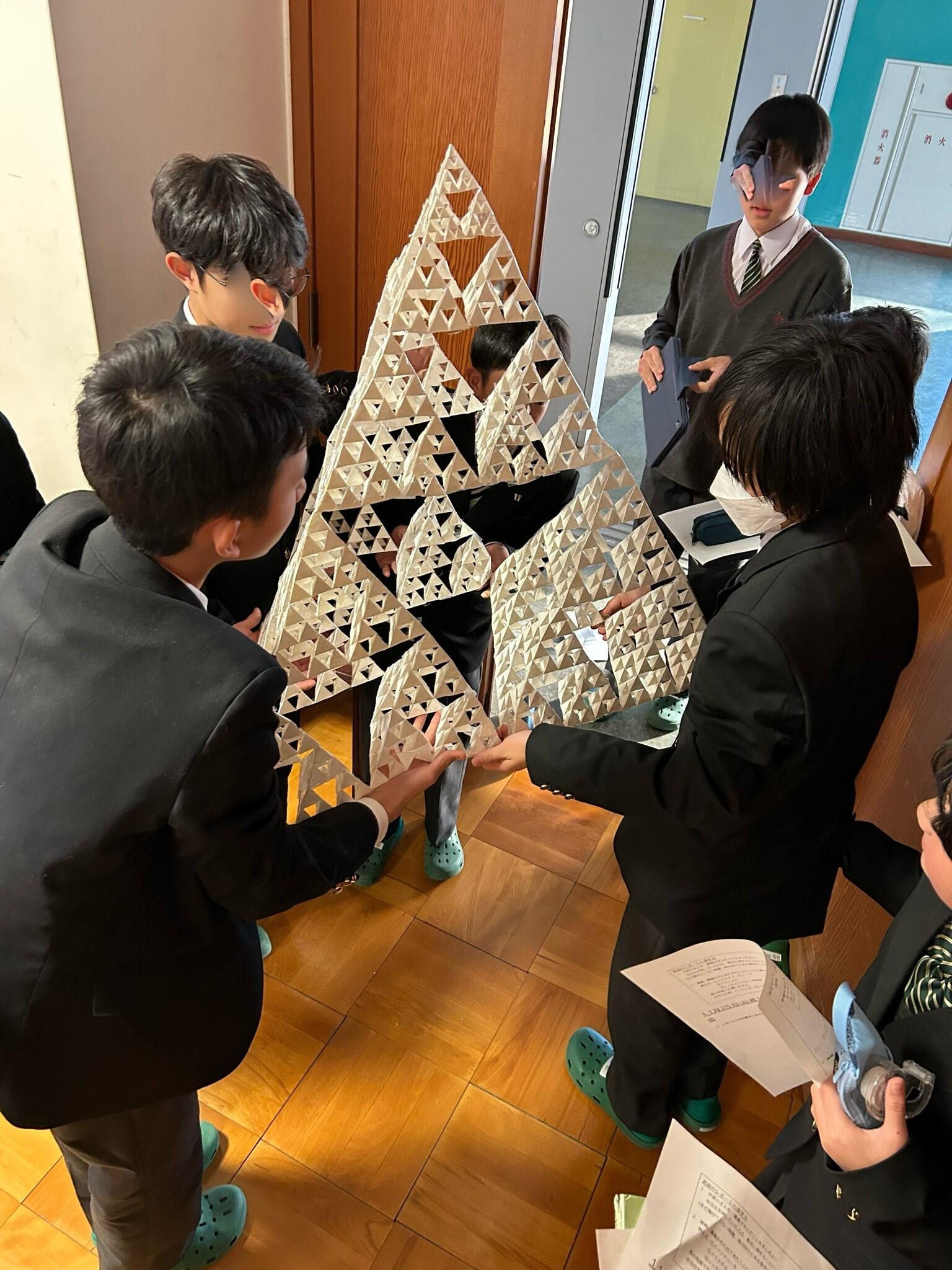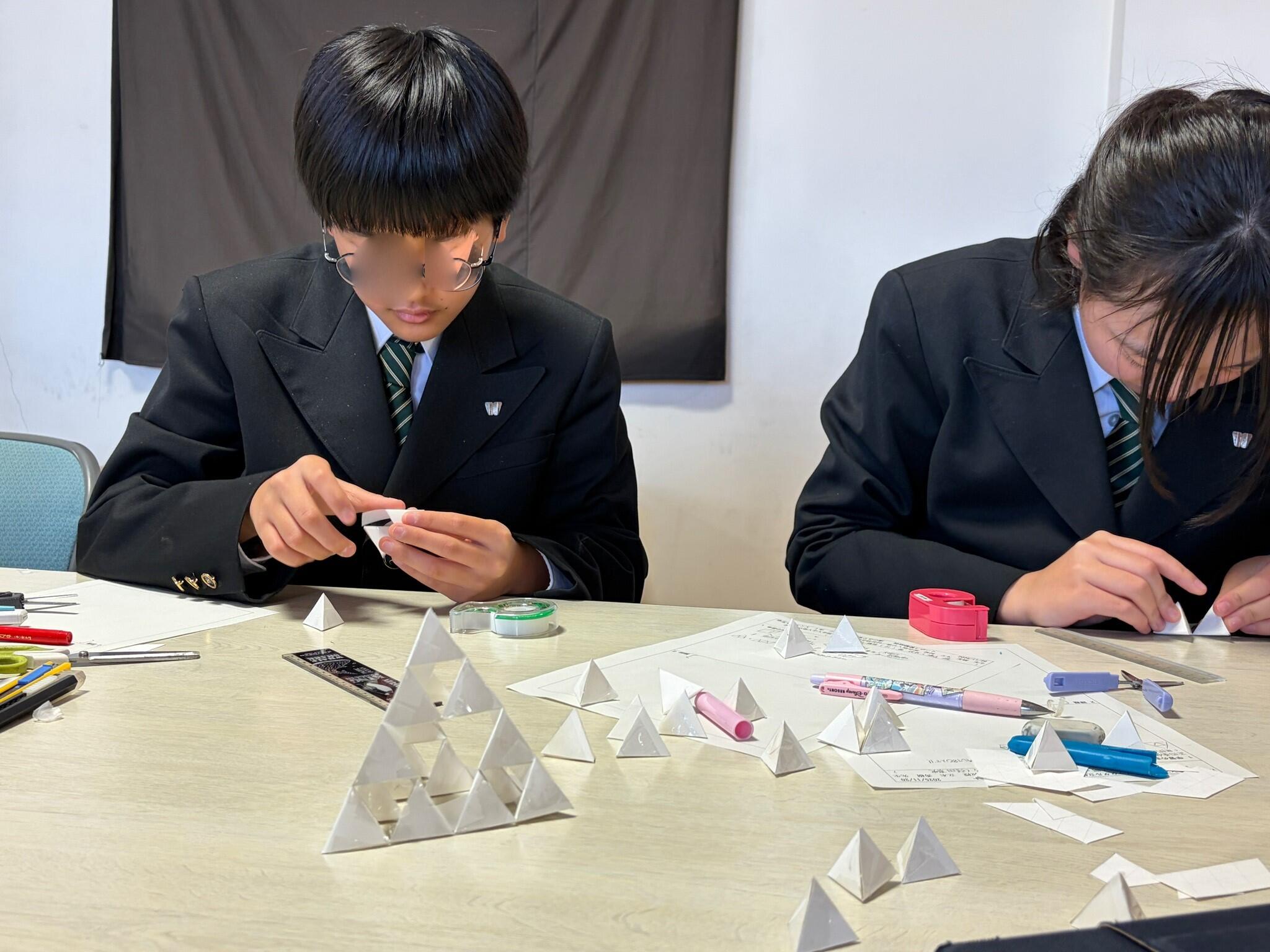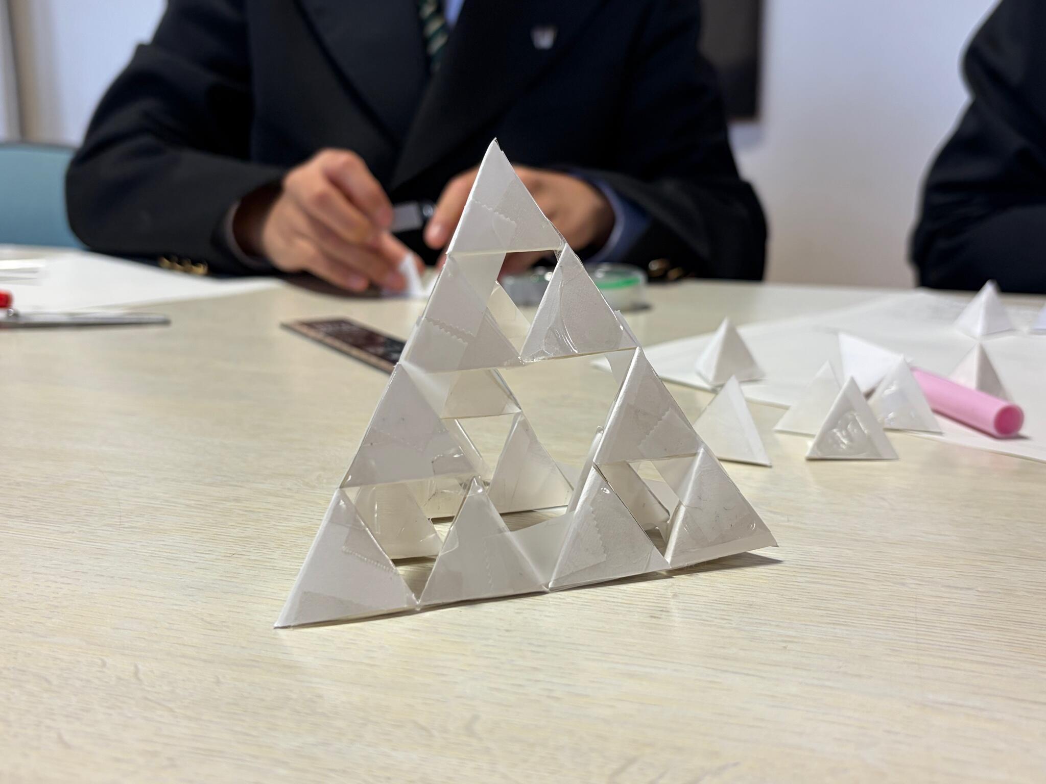小さな正四面体をたくさん作り、それらをつなげた大きな正四面体を作り、、、と手を動かし実際に様子を観察しながらフラクタル立体の持つ特徴やその影の特徴について考察しました。