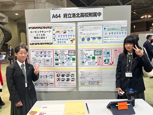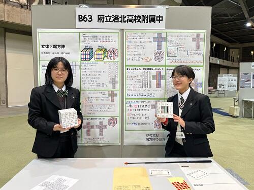 本校独自の教科:洛北サイエンスで行っている数学探究活動の学年代表として「立体魔法陣」「ルービックキューブ必勝法」「渋滞の数理モデル化」の3グループが発表しました。