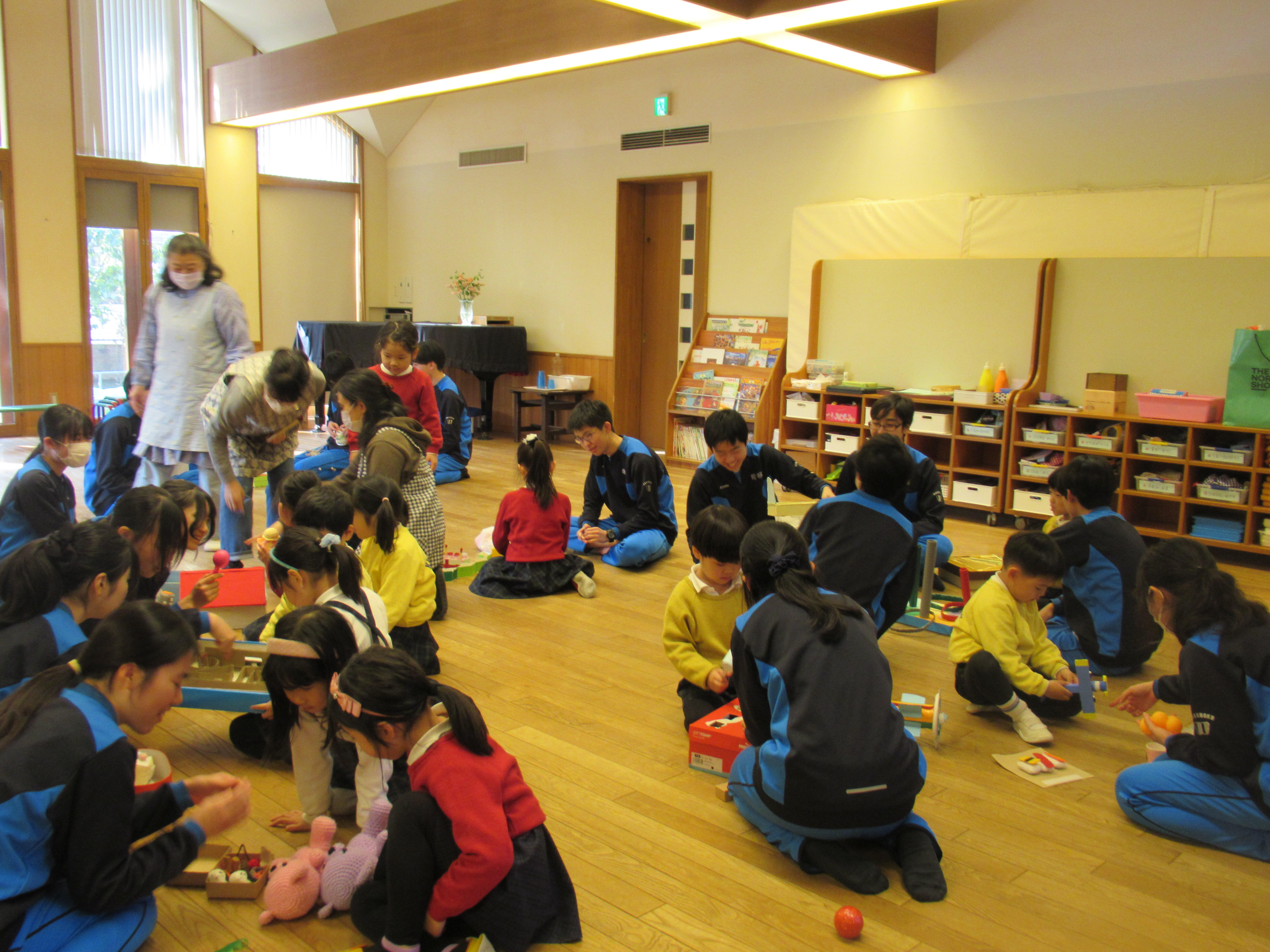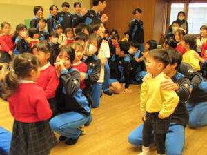 2月12日(木)、3年B組の生徒たちは本校近隣に位置する相愛幼稚園を訪問し、子どもたちと一緒に、生徒それぞれが製作したおもちゃや幼稚園の玩具を使って遊んだり、歌遊びなどをして楽しく交流しました。自分が作ったおもちゃを園児が色々工夫しながら遊んでくれ、その発想がとてもユニークで驚いたり感激したりしていました。また、子ども達との接し方なども考えながら交流していました。生徒たちは園児がとても可愛らしく、「自分もこんな感じだったかなぁ・・」と、幼い頃のことを思い出したり、親への感謝の気持ち改めてもったようです。