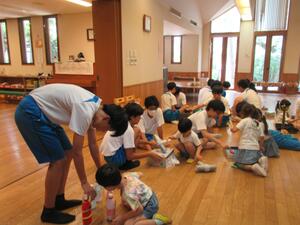本校近隣に位置する相愛幼稚園の子どもたちと一緒に、生徒それぞれが製作したおもちゃを使って遊んだり、ブロックや歌遊びなどをして楽しく交流することができました。手作りのおもちゃは大変好評でした。子どもたち一人ひとりに個性があり、中学生も接し方を考えるなど、多くの学びがあったようです。そして、「自分もこうだったのかなあ・・」と、幼い頃のことを思い出したようです。