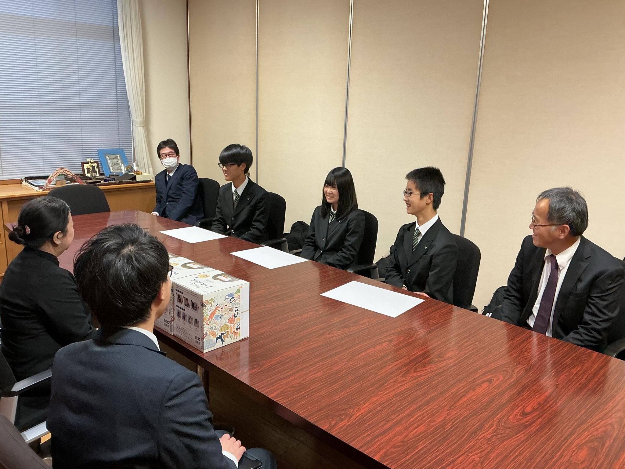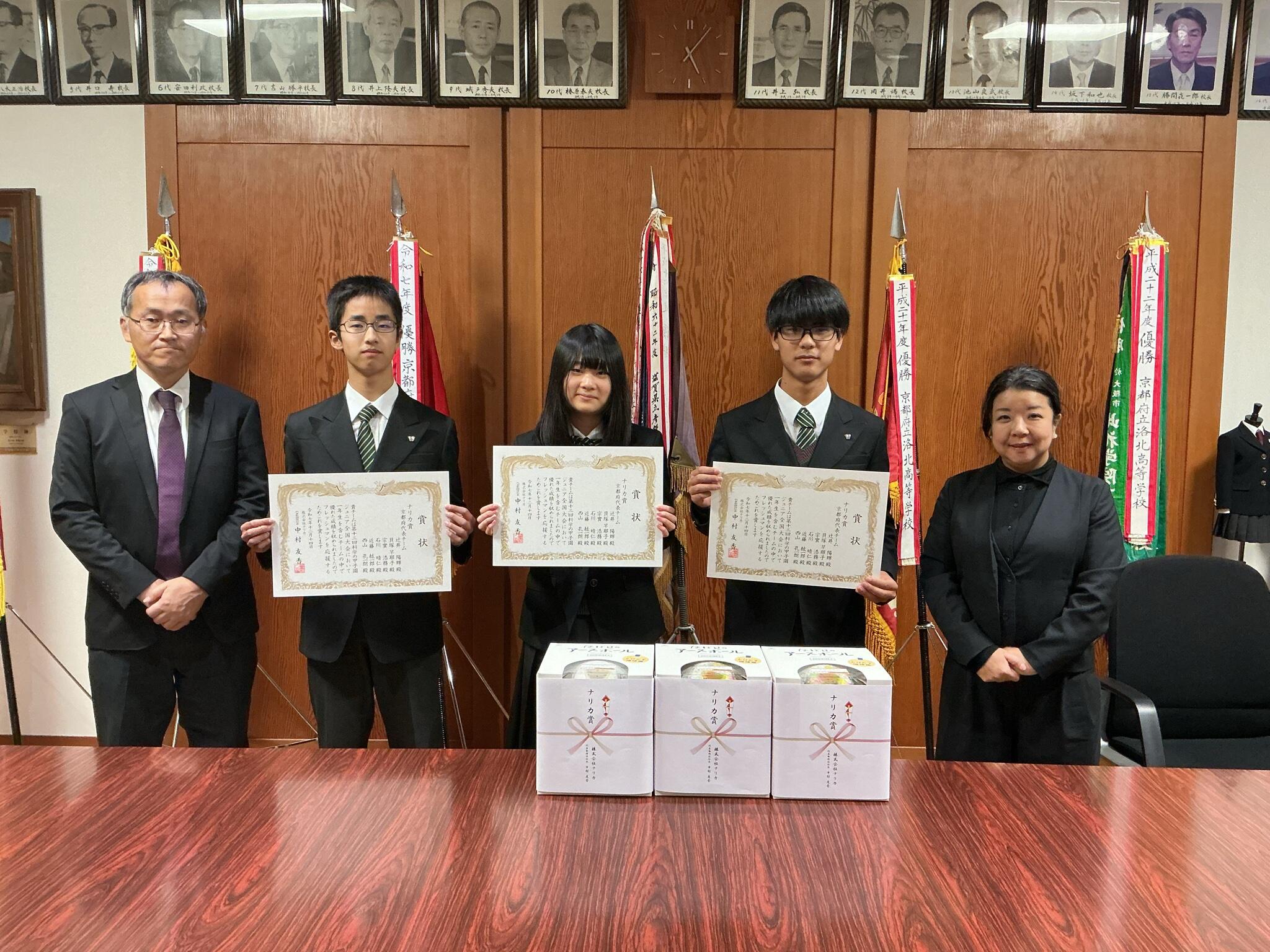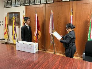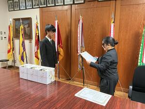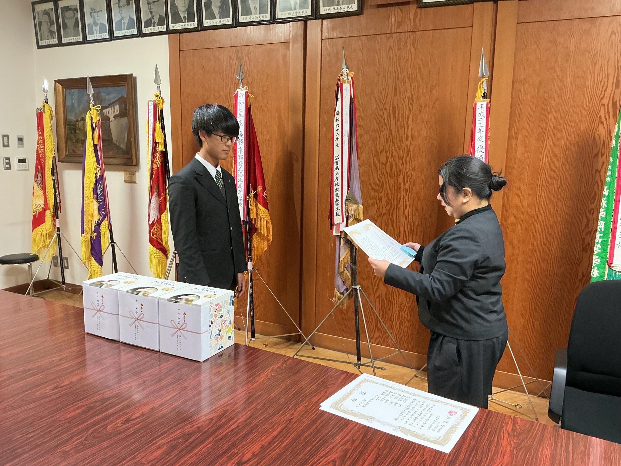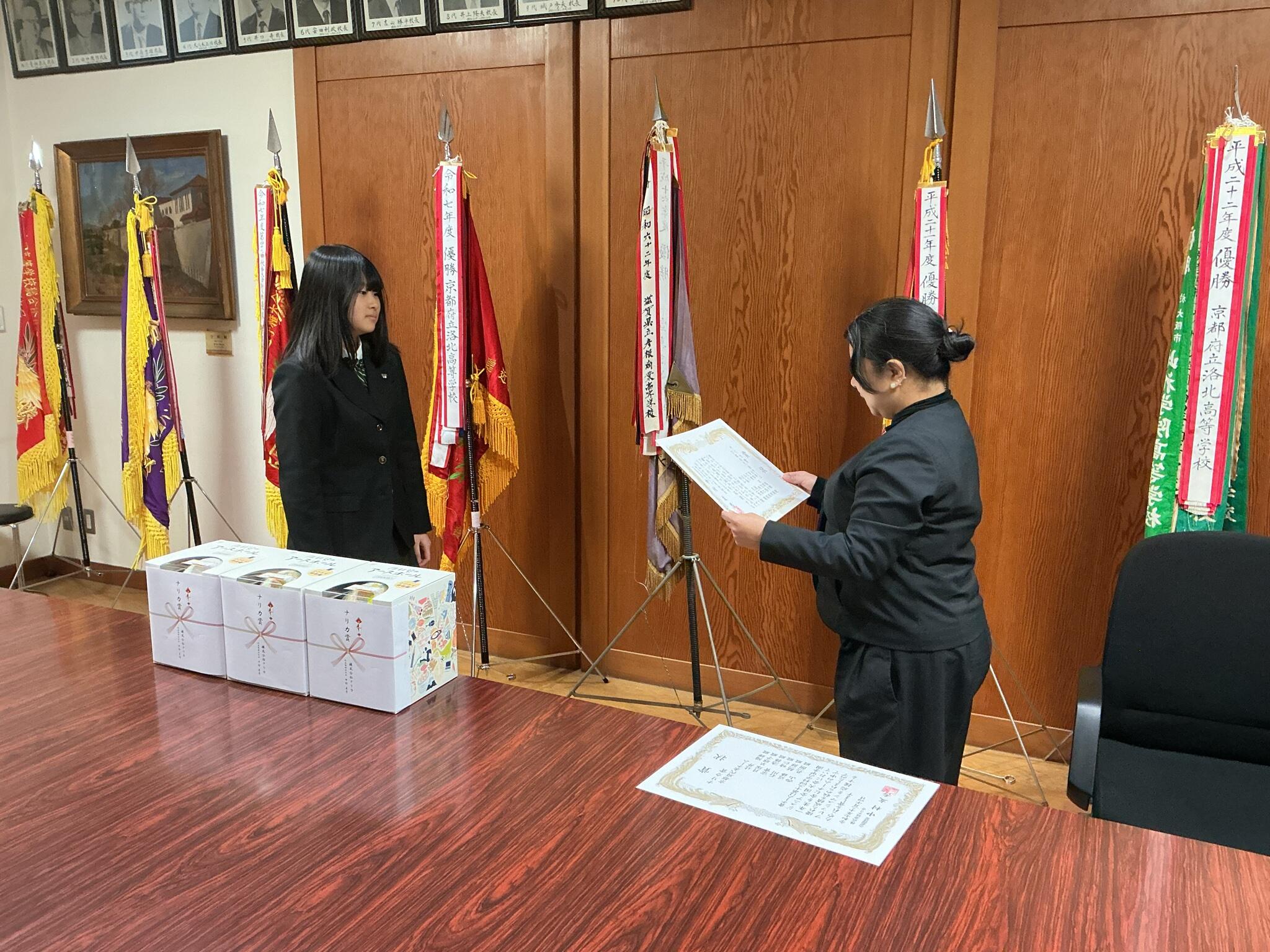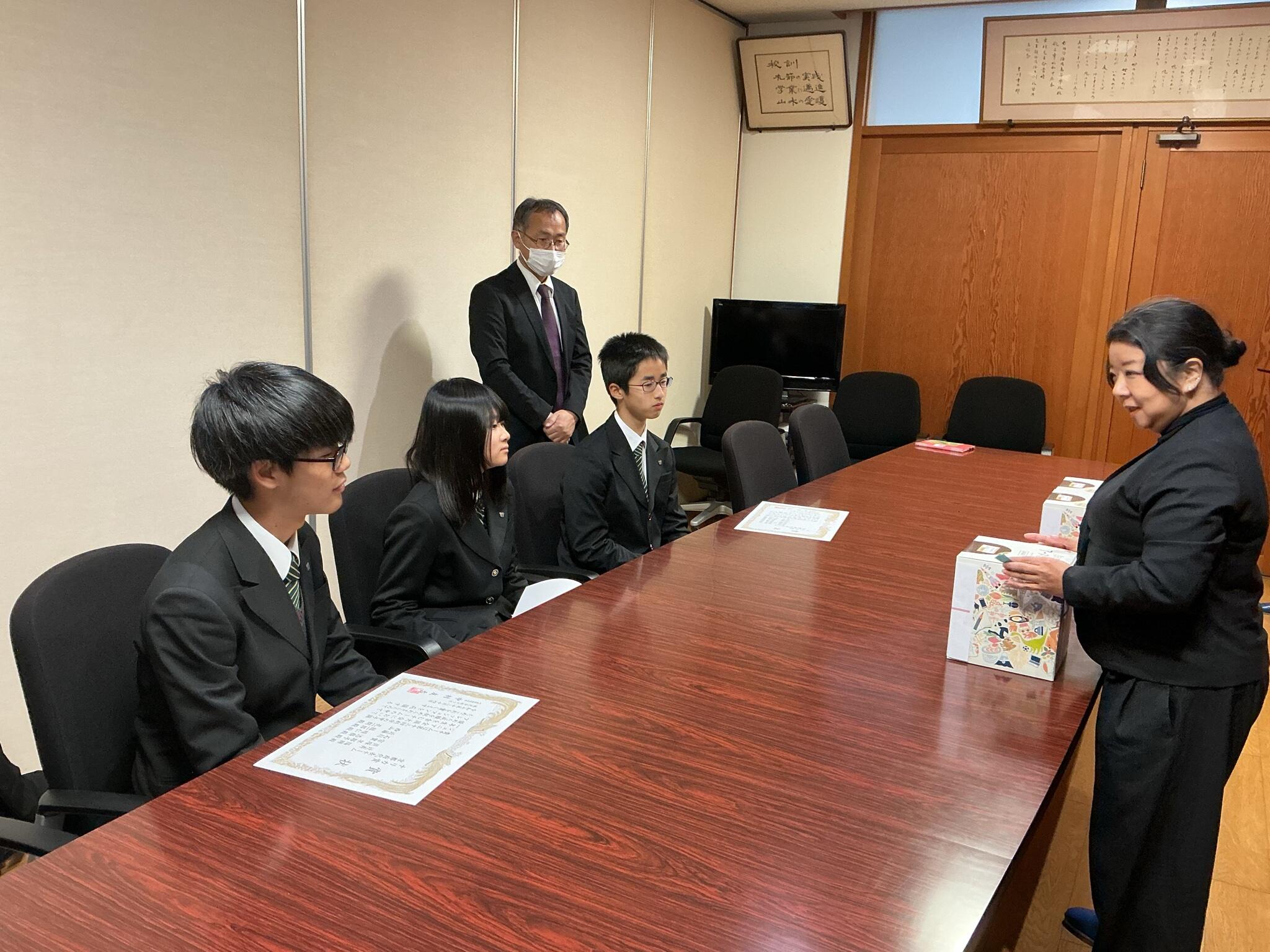 2025年12月に実施された科学の甲子園ジュニア全国大会で京都府チームが受賞したフレッシュマン賞の授賞式を行い、株式会社ナリカの中村社長から賞状と記念品を授与していただきました。
