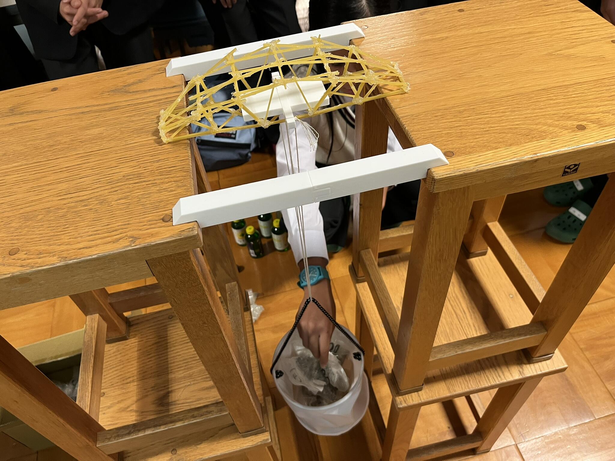 10月25日(土)に、京都Scienceコミュニティ連携企画のパスタブリッジコンテストを実施しました。全国のSSH校と京都府立高校間をオンラインでつなぎ、各校同時にパスタで橋をつくり、その出来を競うものです。去年よりも多い20校、64チームのエントリーがありました。当日は洛北高校・附属中学校含め熱い戦いが繰り広げられましたが、最終的に、22.1gのパスタで4000gの重量を支える橋を作った千葉県の市川学園のチームが優勝しました。また3位には本校のチームが入賞しています。来年も実施するのでぜひ参加しましょう!