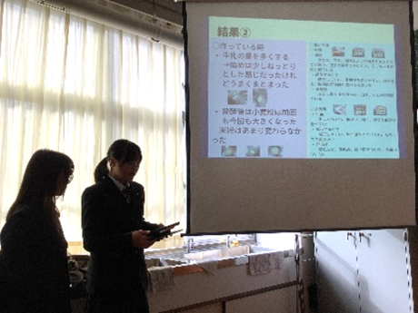 今年度最後のまとめとして、「ノンアレルギーパン」「栄養満点アレルゲンフリーのパン」「小麦アレルギーでもダイエット中の人でも食べられるパン」の3テーマで、前回の実験の結果をもとにグループごとにディスカッションを行い、滋賀大学 加納研究室の学生の皆さんの前で取組の成果発表をしました。仮説通りにはいかなかったものの、新しい食感が生まれたり、次に挑戦してみたいレシピを考えたり、改めて料理は科学であること、まだまだたくさんの謎があることを実感できたようです。