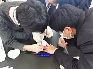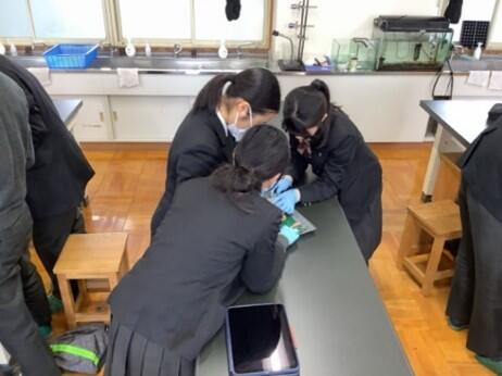 ヒトの心臓は、一生の間、一瞬も休まずに約30億回も拍動するそうです。そんな心臓がどのような作りになっているのか、ヒトとほぼ同じ大きさ(250~300g)だと言われるブタの心臓(ハツとして食用に販売されているもの)を使って観察してみました。分厚い筋肉や逆流を防ぐ弁の構造、心臓から出ている大動脈などをじっくり観察しました。予想以上に複雑な構造に驚き、その重要性を再確認する貴重な体験になりました。