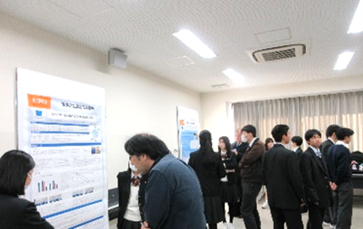 課題探究Ⅱで行った研究に関するポスターを英語で作成・発表しました。京都工芸繊維大学より、名誉教授の堤先生と修士・博士課程に在籍する留学生15名を評価者として招き、本セッションを開催しました。理系分野で高い専門性を持つゲストを相手に英語でグループ発表をし、質疑応答のやりとりを行いました。留学生の方々から本校の生徒に対して、「丁寧な英語の説明と高度な内容に感銘を受けた」とコメントをいただきました。