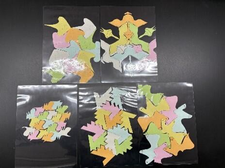 エッシャーの絵のいくつかはテセレーションと呼ばれ、数学的な考察が可能です。今回はテセレーションを用いた作品づくりのために、対称性についての講義や図形の変形のしかたの説明をしたあと、実際に作品を作りました。専用のwebサイトを参考にしながら、自作の模様をコピー機で増やして並べました。全員がきれいな作品を作ることができて、最後にそれぞれの作品がもつ対称性がどんな分類になるか(p2, p3, p3m)を解説しました。