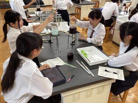 ログウッドから抽出できる染料を使って草木染を行いました。はじめに、媒染液に含まれる金属イオンや液性を変えたり、絹やウール、綿など染める布の種類を変えたりすることで、発色が変わることを確かめました。その後、綿のハンカチやウールのコースターを染める活動を行いました。「空色」「灰色」「ピンク」など目標とする好きな色を班で話し合い、媒染液や染料の濃度を工夫して染色に挑戦しました。思い通りの色に染まらない班もありましたが、「自分達で方法を考え、染めるのは理解も深まり楽しかった」という前向きな感想が聞けました。草木染を通して、科学的に考え試行錯誤する楽しさを体験できたようです。