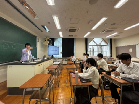 医師であり、京都大学理学研究科博士課程2年生でもある河村恒次氏を講師にお迎えして、「大学への生物 〜どう考え、どう覚えるか〜」をテーマに、実験考察を行いました。前半では、実験データをもとに複数の仮説を立て、それに基づいて次の実験を計画するトレーニングを体験しました。生徒たちは積極的に意見を交わし、仮説の立て方や検証方法について活発な議論が展開されました。後半では、理科の知識を「つなげて覚える」ことの重要性と、その具体的な実践方法について学びました。AI時代においても、深く考えるためには関連づけた記憶が不可欠であることを再認識する内容でした。生徒たちにとって、大学レベルの思考に触れる貴重な機会となり、学びへの意欲が一層高まった様子がうかがえました。