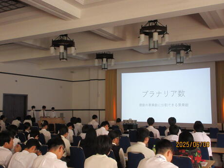課題探究Ⅱで行う課題研究の計画を発表し、本校教員や生徒からアドバイスをもらい、研究の高度化を目指した本発表会を5月23日(金)・30日(金)の3時間の設定で、視聴覚教室とコモンホールの2会場で実施しました。発表会では各班の発表のあと質疑応答を行いましたが、時間が足りないほど活発な質問やアドバイスが交わされました。発表者はもらった質問に対して真摯に答えるとともに計画の再検討を考える機会となりました。質疑応答の不足分はアドバイスカードを利用してアドバイスや質問を各班に送りました。この発表会をもとにして本研究がスタートします。今後の研究の進行が楽しみです。