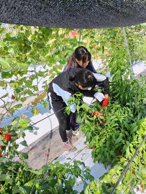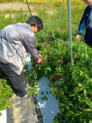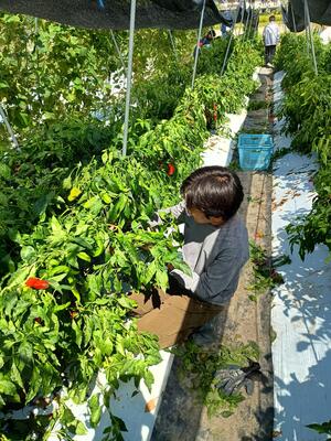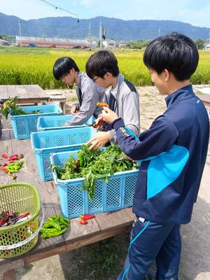 BNRファームさんで、万願寺とうがらしの誘引作業を行いました。非常に繊細な作業で、生徒たちもドキドキしながら作業に取り組みました。折れてしまうと、農家さんの収入が減ることもお聞きし、緊張感を持って取り組んでいました。それでもあちこちで、「うわ~折れてしまった!」という叫び声が聞こえました。