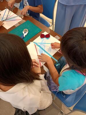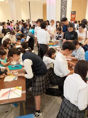 午後からはワークショップも行いました。校内文化祭と同様の端切れを使ったミサンガ作りを行いました。こちらもたくさんのお客さんに来ていただき、大盛況でした。循環する服の中には、汚れや破れなどでどうしても循環に回らないものもあります。それらの服を他の形で活用できれば、ゴミとなるとしても最後の最後まで、使い切ってからゴミとすることができます。
