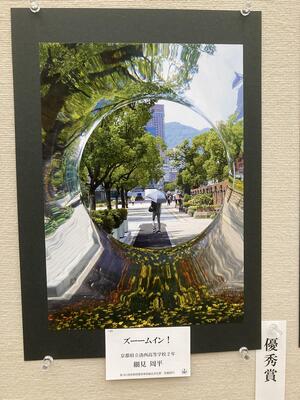 10月18日(土)・19日(日)に「日図デザイン博物館」(みやこめっせ地下1F)で開催されました第42回京都府高等学校総合文化祭写真部門に本校写真部より23名の23作品を出品しました。本年度出品された254作品の中より、最優秀賞1作品・優秀賞1作品が選ばれ、本校2年生の細見周平君の作品「ズーームイン!」が優秀賞に選ばれました。今後の写真部の益々の活躍に期待したいと思います。