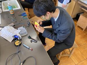 9月からスタートしたロボットづくりでしたが、彼らが想像していた以上に組み立てや配線が難しく、作業は難航していました。そこで、このプログラムでお世話になっている一般社団法人次世代ロボットエンジニア支援機構(通称 Scramble)の方に本校に来ていただいて、直接高校生に指導していただく機会を設けました。専門家からの助言を受けたことで、生徒たちはこれまで曖昧だった部分を一つひとつ理解し、作業の進め方にも自信が生まれました。実際に手を動かしながら学ぶことで、ロボットの構造や仕組みをより深く理解できたようです。そして何より、生徒たちが「もっと良いものを作りたい」と前向きな姿勢になったことが、大きな成長として感じられました。