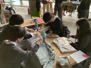 デニムにスプレーを吹きかけたり、生地を漂白剤で脱色することで絵を表現したりと、それぞれユニークな方法でリメイクしていきます。高校生の若い感性で、どれも個性的で素敵な洋服に仕上がっていきました。同じ方法でも仕上がりが全く違うことに驚きの声も上がっていました。最後には「捨てるはずだった服が、こんな風に使えるなんて面白い」、「今までのLinks活動でやってこなかったアートな取組で面白かった」という感想も聞かれました。