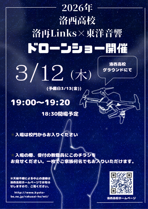 本日、3月12日(木)のドローンショーは予定通り開催いたします。開場は18時30分、開始は19時を予定しております。会場は本校グラウンドです。