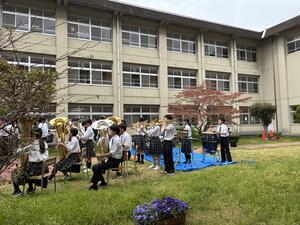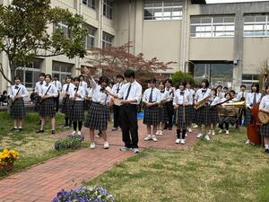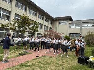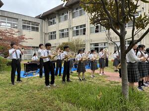 4月9日(木)のお昼休みに、吹奏楽部が中庭で新入生歓迎パフォーマンスを行いました。